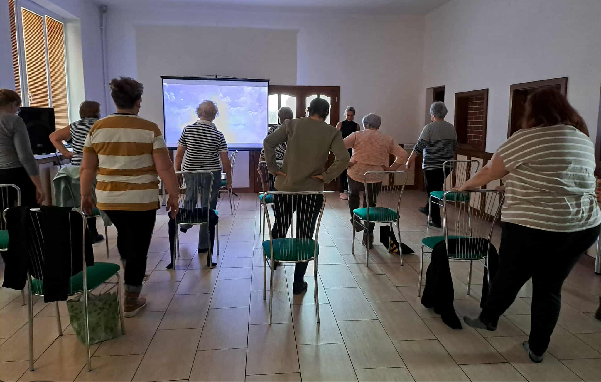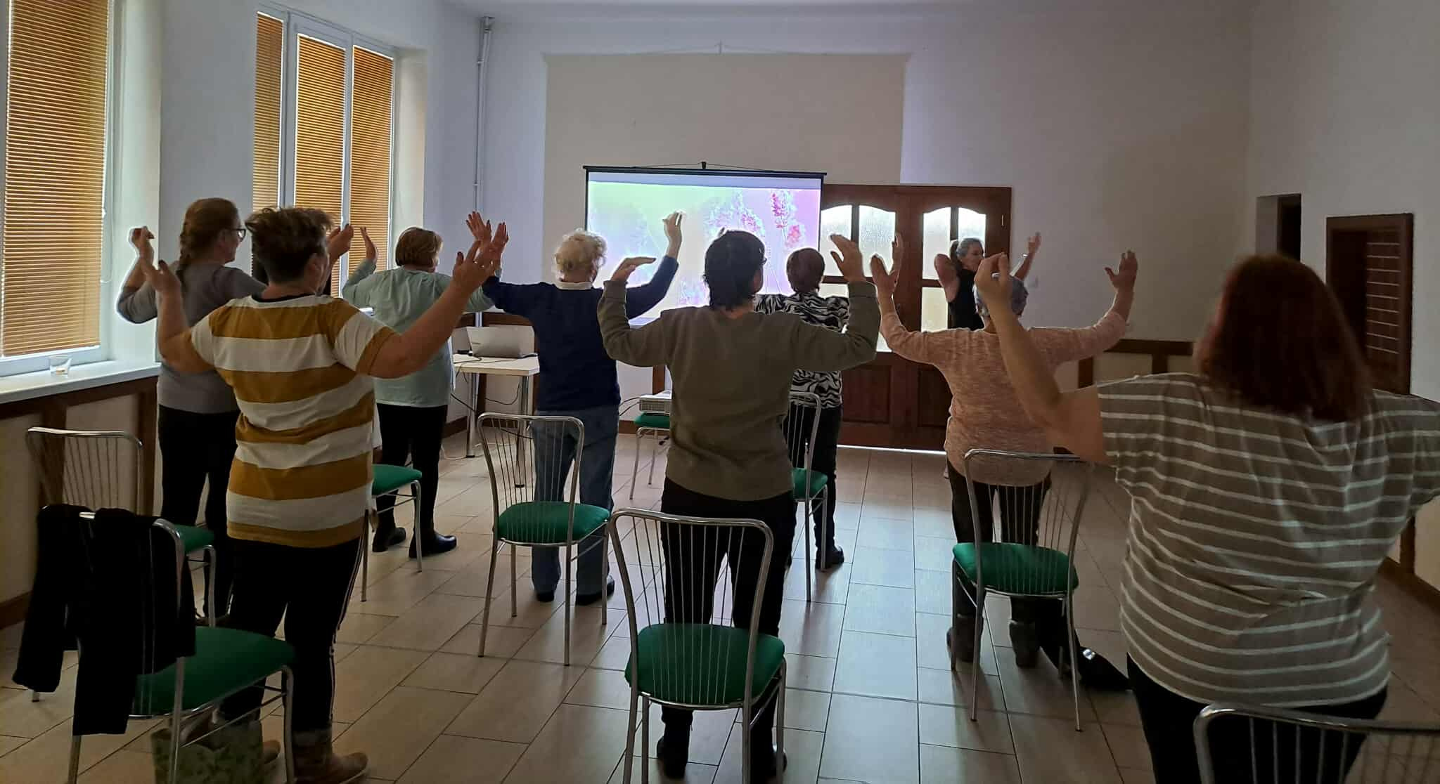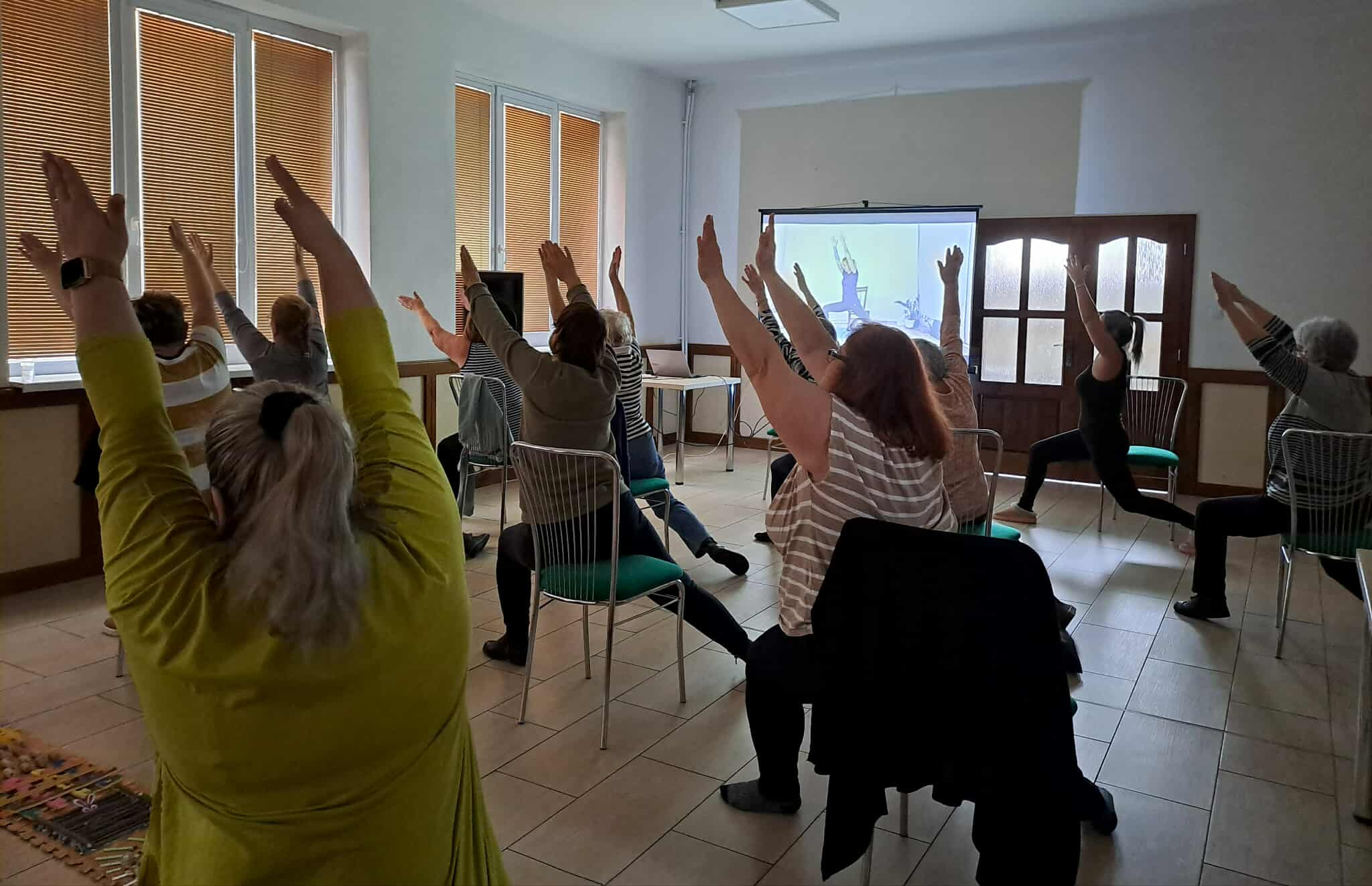 Účastníčky aktivity si mohli vyskúšať jednoduché cvičenia na stoličkách, zamerané na rozhýbanie tela, zlepšenie pohyblivosti, rovnováhy a uvoľnenie napätia. Dychové a relaxačné techniky prispeli k celkovej psychickej pohode a vnútornému pokoju.Program doplnil senzomotorický chodník, ktorý podporil masírovanie chodidiel, lepšie prekrvenie dolných končatín a stabilitu pri chôdzi. Pre veľký úspech a spokojnosť účastníčok nás seniorky poprosili o pokračovanie aktivity v pravidelnom – týždennom – intervale, čo nás veľmi potešilo a utvrdilo v zmysle takýchto stretnutí.