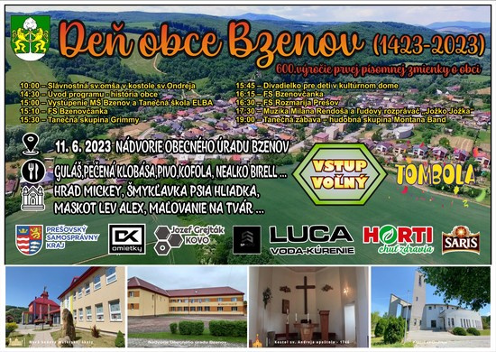 Z príležitosti 600.výročia prvej písomnej zmienky o obci Bzenov, Vás srdečne pozývame na Deň obce ,ktorý sa uskutoční dňa 11.6.2023.