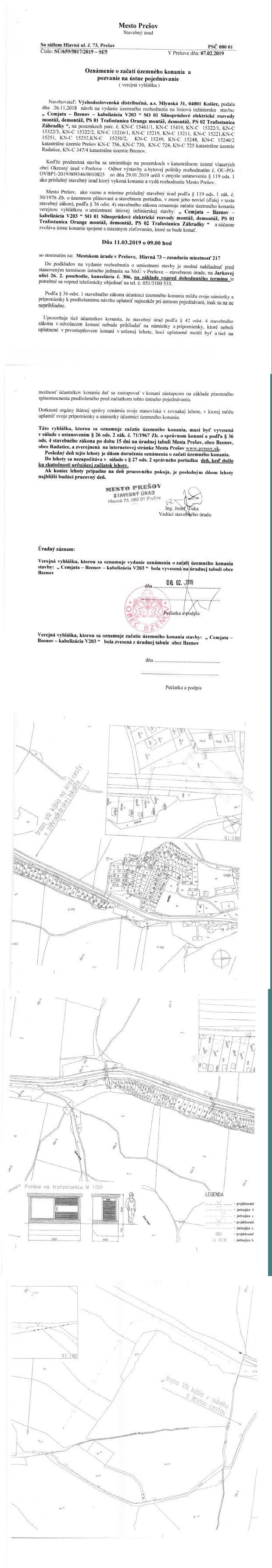 Oznámenie o začatí územného konania pre líniovú inžiniersku stavbu Cemjata - Bzenov - kabelizácia V203 "SO 01 Silnoprúdové elektrické obvody montáž, demontáž, PS 01 Trafostanica Orange montáž, demontáž, PS 02 Trafostanica Záhradky. Pojednávanie sa uskutoční dňa 11.03.2019 o 9:00 na Mestskom úrade v Prešove, Hlavná 73, zasadacia miestnosť č.217. Navrhovateľom je Východoslovenská distribučná a.s., Mlynská 31, 040 01 Košice.