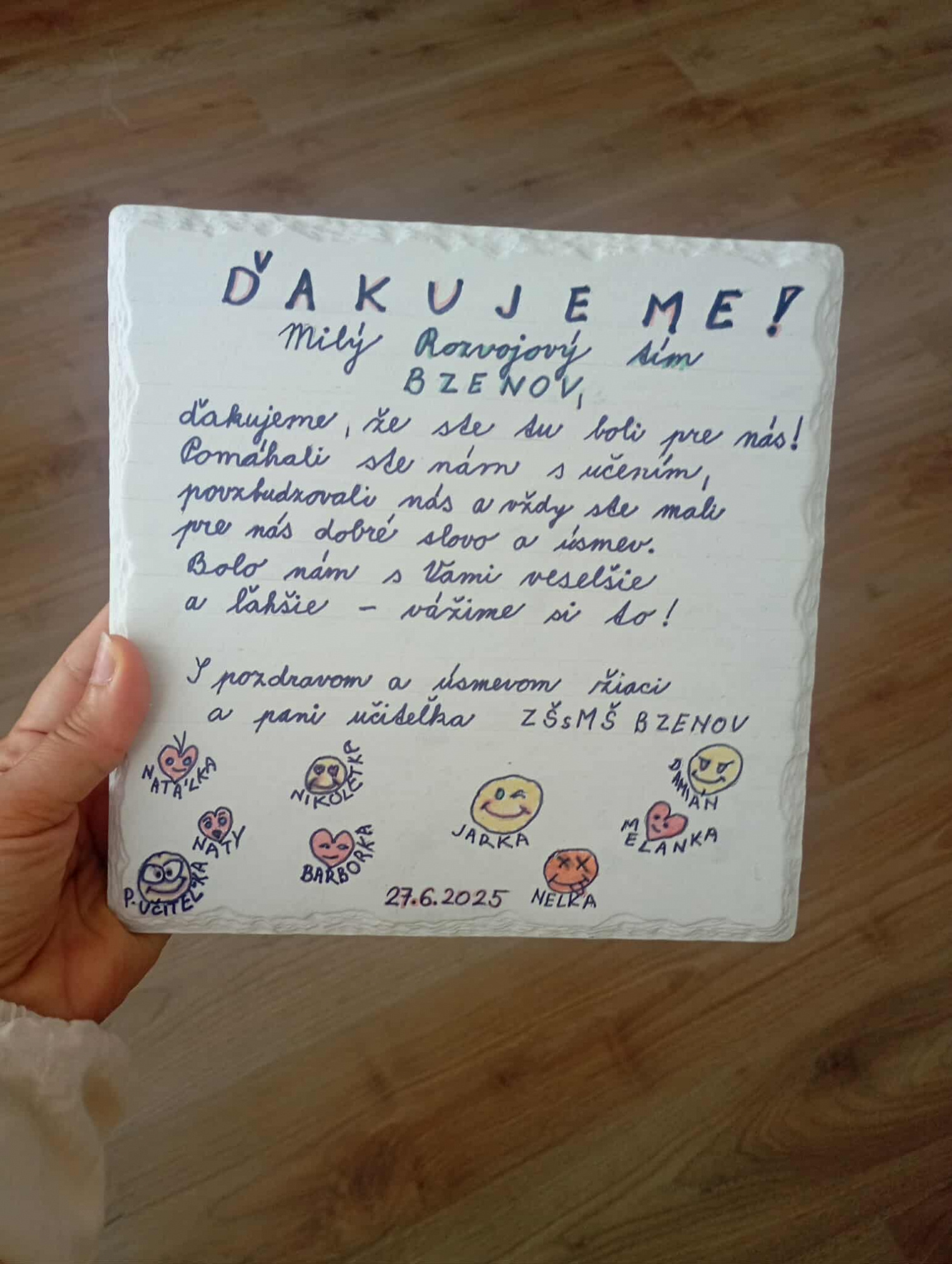 Rovnako veľká radosť nás čakala aj na druhej strane – Rozvojový tím Bzenov dostal krásne poďakovanie od žiakov a pani riaditeľky, čo nás veľmi potešilo a dodalo motiváciu do ďalšej práce.